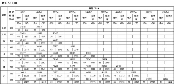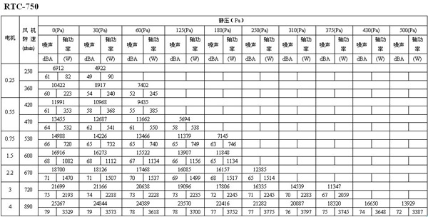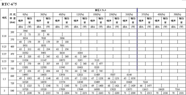如下面的表格所示,如果選用風量為16273m3/h,靜壓為30Pa的風機,其轉速為600 r/min,聲壓級為68dB(A),實際耗功率為1112W,選配電機功率為1.5kW。