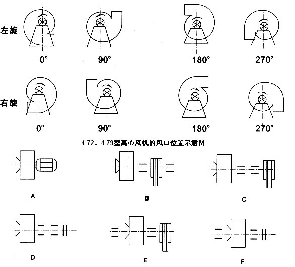 風機分左旋和右旋兩種型式,從電機(皮帶輪)側正視,葉輪按順時針方向旋轉為右旋,逆時針旋轉為左旋。A式為電機直聯傳動, B、C、E式為皮帶傳動,D、F式為聯軸器傳動。